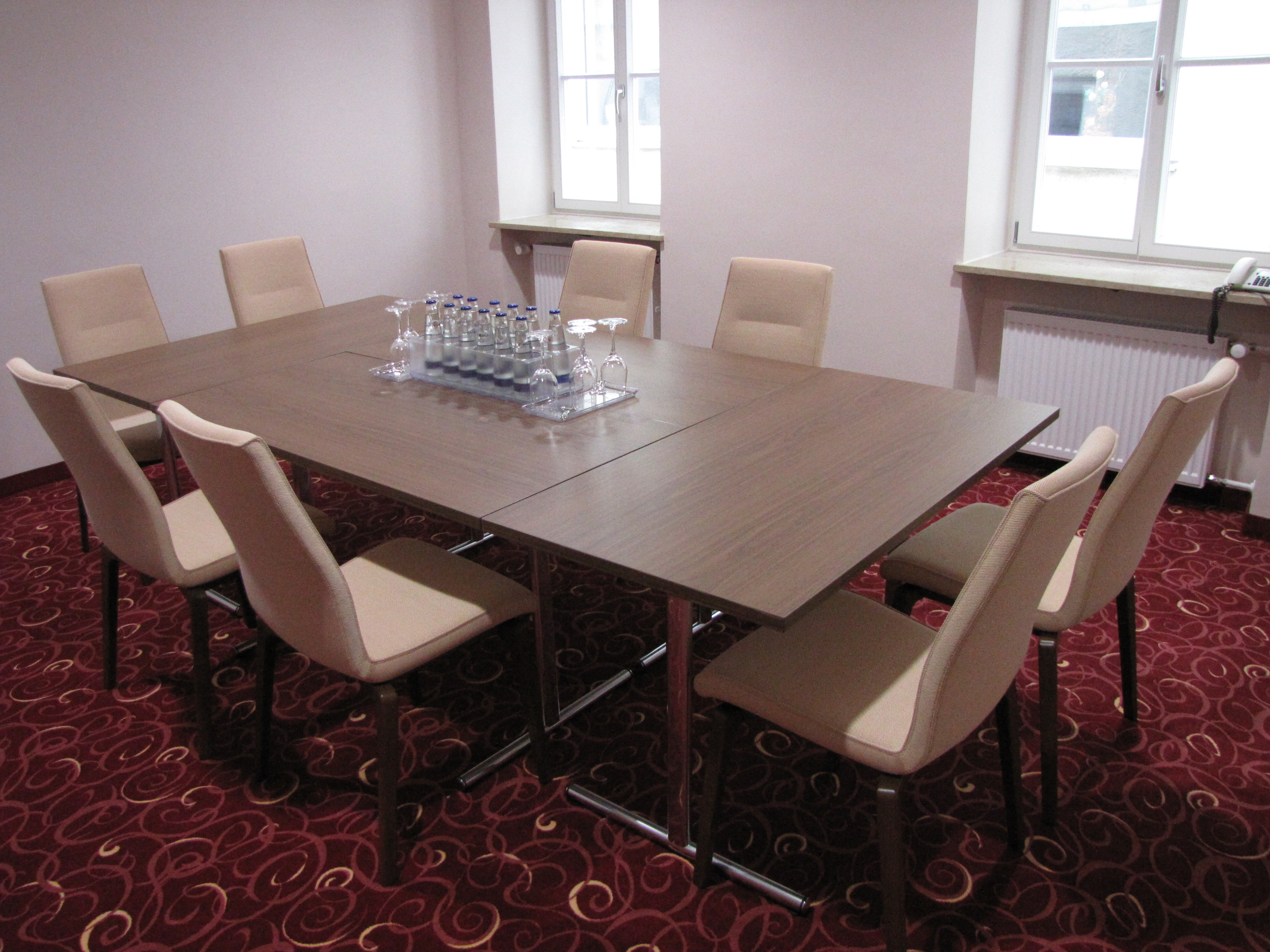 Unser kleiner Tagungsraum hat eine Fläche von ca 18 qm mit einer Seitenlänge von 4,80 x 4,50 m. Der Raum verfügt über Tageslicht. Folgende Bestuhlungen sind möglich: